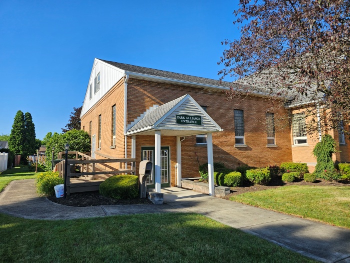 Albert B. Simpson (1843-1919), a Canadian theologian, left the Presbyterian Church in 1881 and established two separate missionary-based entities that later (in 1887) became known as the Christian & Missionary Alliance Church (CMA). Based in New York City, this new Christian organization placed a heavy emphasis on foreign missionary work. Several CMA groups were established in Lawrence County, Pennsylvania, in the early 1900’s, including at Ellwood City in 1926. The congregation initially met at a mission on Bell Avenue and eventually a brick church building (shown here) was erected on Jefferson Avenue in Ewing Park in 1948. The congregation, with a dedicated community outreach program, changed its name to the Park Alliance Church in late 2010, but remained affiliated with the international Alliance World Fellowship (also known as the CMA). (Oct 2012) |