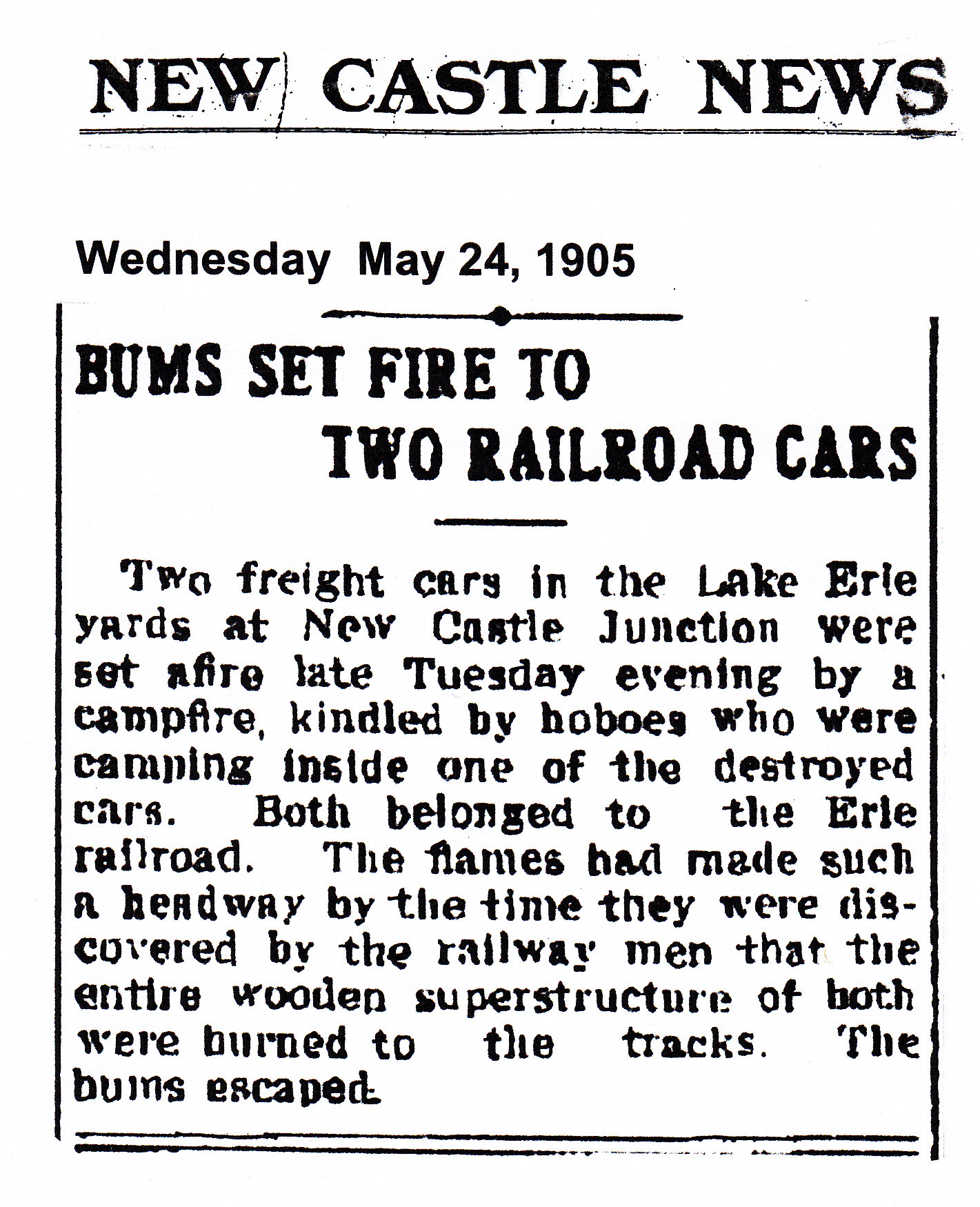 New Castle Junction Rail Yard - Bums Set Fire (Article) Comments There are currently no comments on this article. Comment Enter your comment below. Fields marked * are required. You must preview your comment before submitting it. Name * Email * Message *