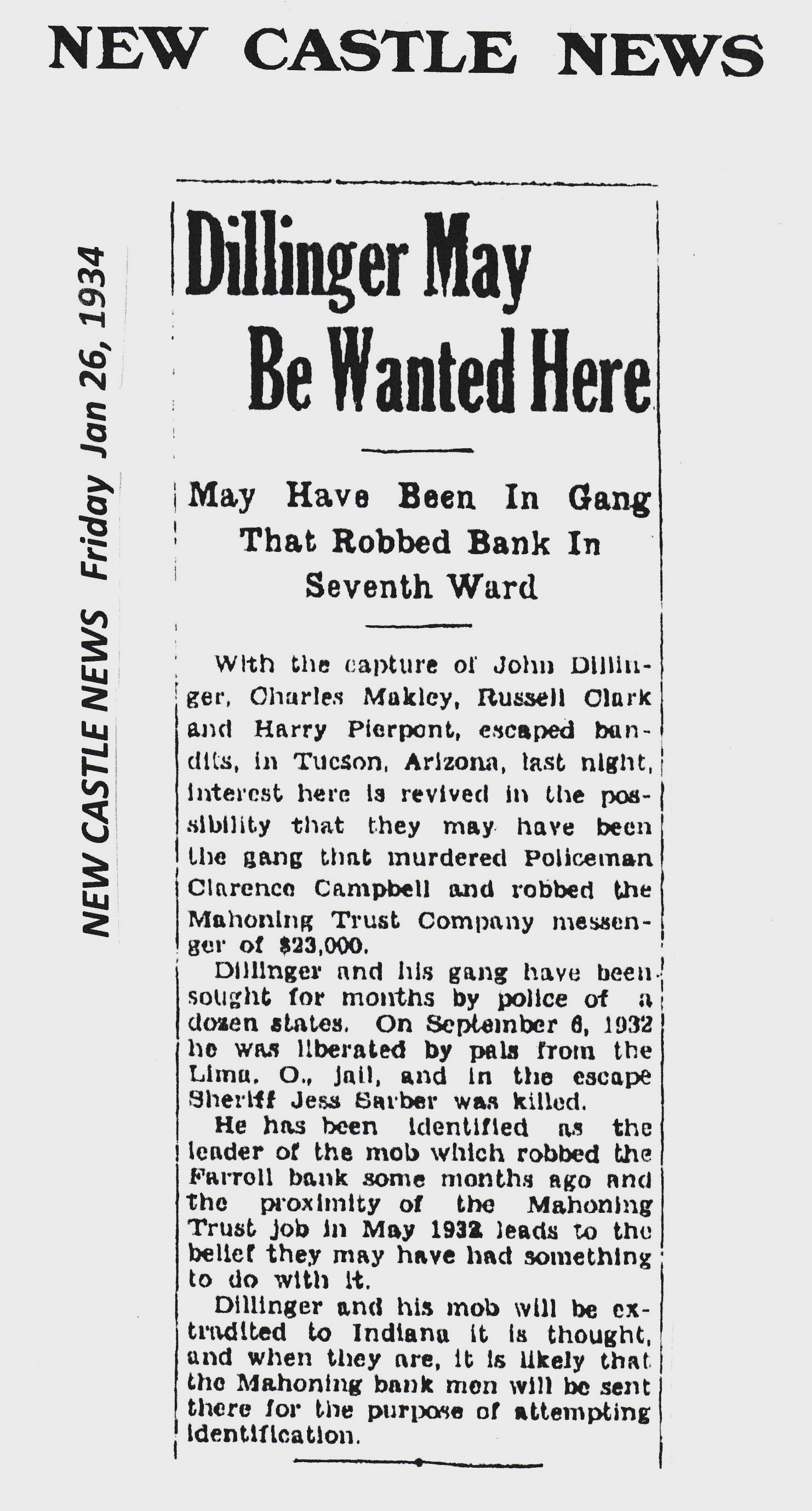 Mahoning Trust Robbery (Clarence Campbell Murder) - Dillinger May Be Wanted Here (Article) Comments There are currently no comments on this article. Comment Enter your comment below. Fields marked * are required. You must preview your comment before submitting it. Name * Email * Message *