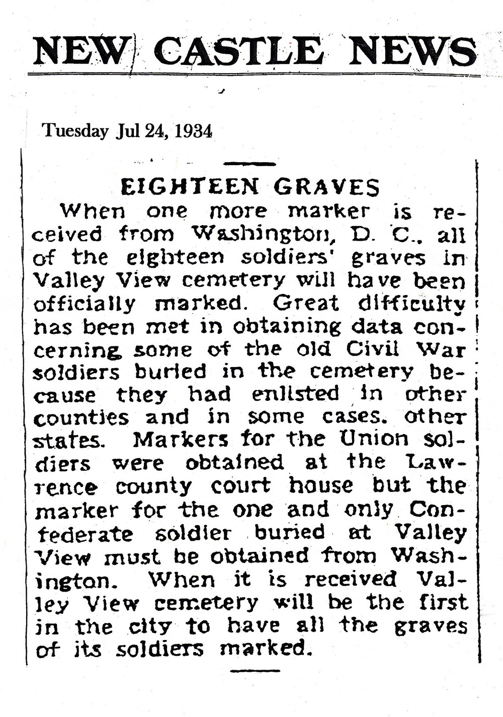 Valley View Cemetery - 1934 Veterans' Article Comments There are currently no comments on this article. Comment Enter your comment below. Fields marked * are required. You must preview your comment before submitting it. Name * Email * Message *