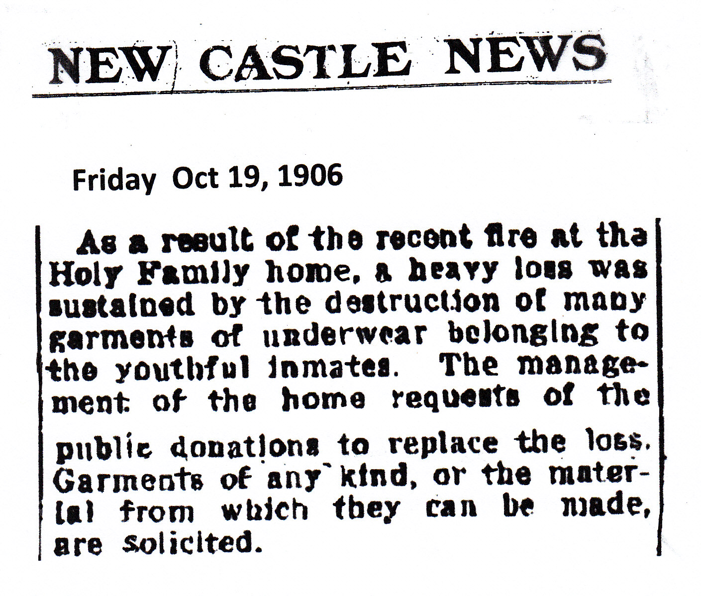 Holy Family Home/Margaret Henry Home – Fire Loss Comments There are currently no comments on this article. Comment Enter your comment below. Fields marked * are required. You must preview your comment before submitting it. Name * Email * Message *