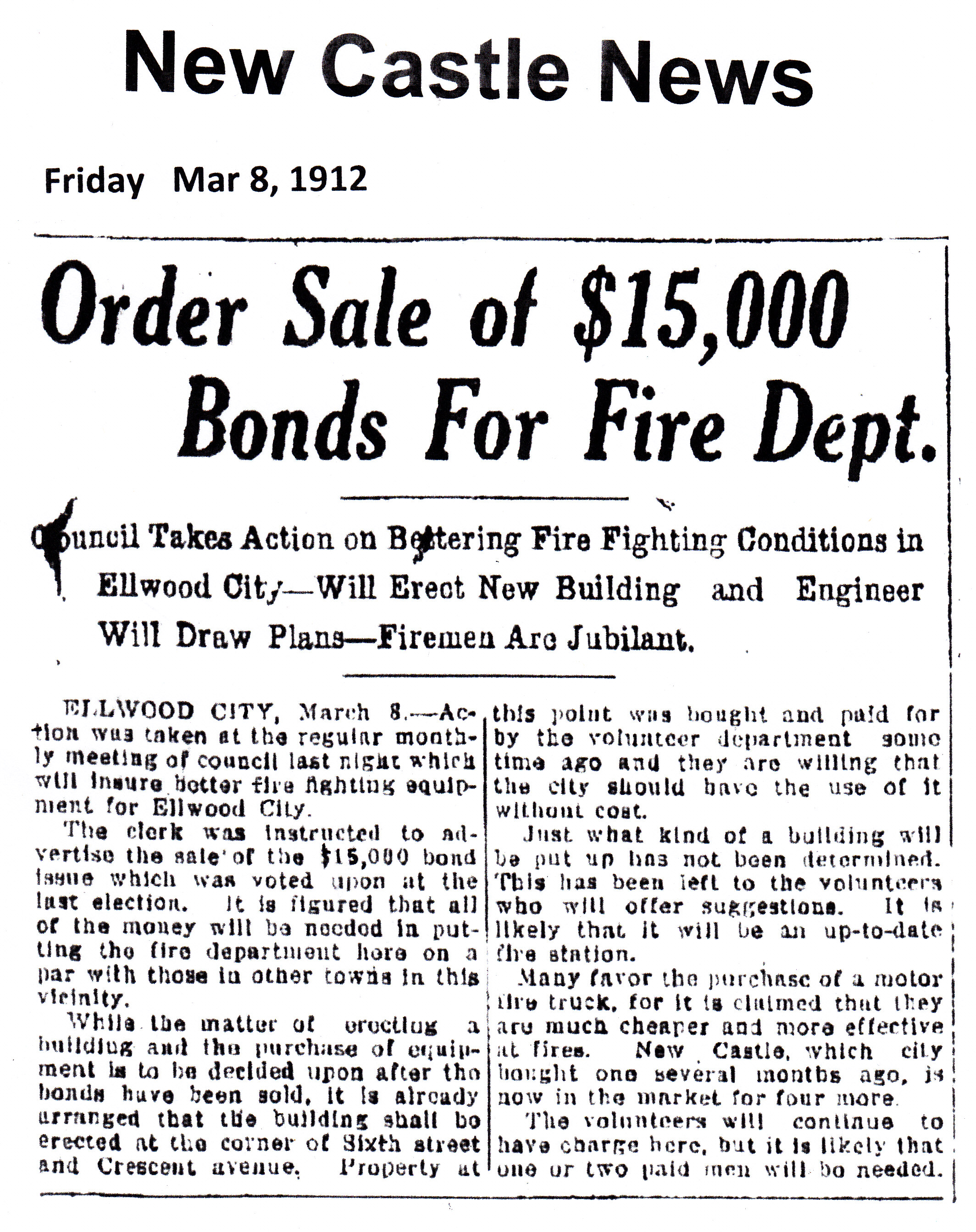 Ellwood City Fire Department - Bonds for Fire Dept (Article) Comments There are currently no comments on this article. Comment Enter your comment below. Fields marked * are required. You must preview your comment before submitting it. Name * Email * Message *