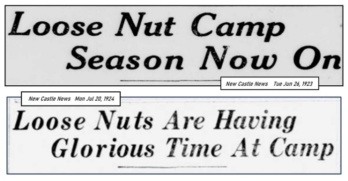 The New Castle News of Thursday, July 21, 1921, provided an update on the first year’s outing with, “Under the capable leadership of Paul Diller, who had just returned from Erie, where he had been leader of several clubs there, the Loose Nut club is getting along splendid under his directions. He has been the main factor in getting the club organized and has worked hard to get things in shape… The camp is at New Wilmington junction, and near it is the best swimming hole in the county.”